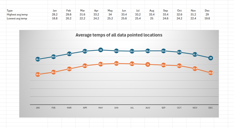 The final output is a graph displaying the average temperatures for each month. While this data may not reflect the exact location due to the absence of a weather station, it represents a nearby area within the same region, providing an accurate and relevant approximation.